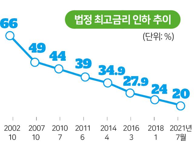 적용되는 최고금리는 연24$에서 20%로 4%포인트 내린다. 대출계약을 새로맺거나 갱신,연장하는 계약이 대상이다.